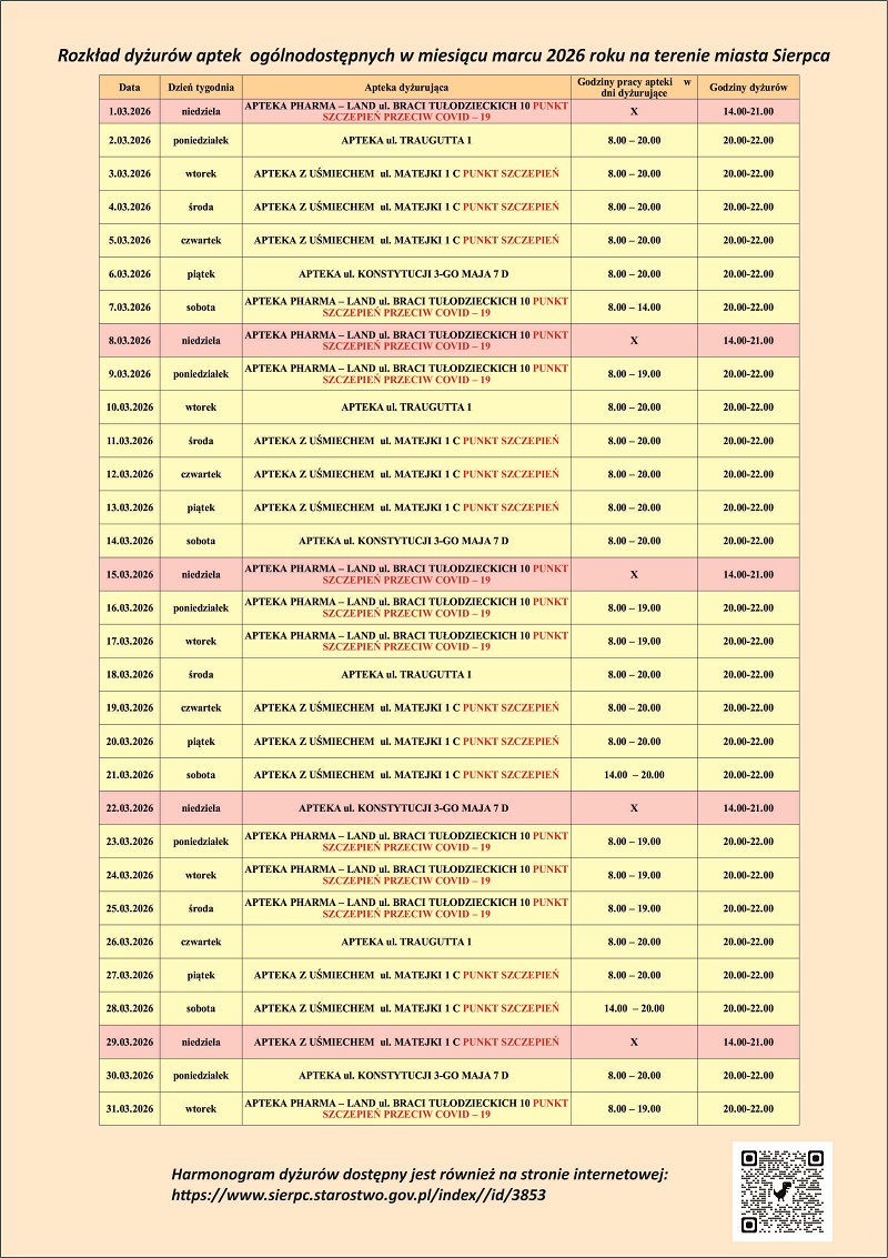 Harmonogram dyżurów aptek ogólnodostępnych w miesiącu marcu 2026 roku na terenie miasta Sierpca